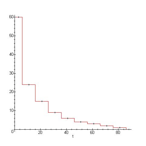 From this law of mortality it follows easily that the remaining expected life of anyone at age t is as indicated in the graph below. Observe how peculiar and unrealistic this graph appears.