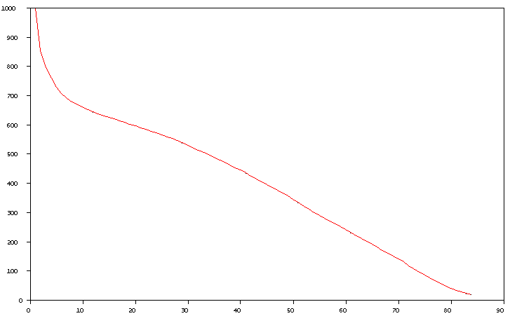 The number living by year is plotted below. It should be noted how strikingly different a correct life function differs from that conjectured by Graunt. Also note the terrible toll taken by infant mortality.